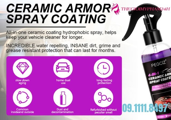 Pegciz 4 in 1 Ceramic Armor Spray Coating không chỉ đơn thuần là giúp khôi phục màu và bảo vệ nhựa cho xe mà còn mang nó còn mang lại sự quý phái về mặt thẩm mỹ cho xế cưng của bạn mỗi khi lăn bánh trên mọi cung đường. Sản phẩm đang được bày bán tại thegioimypham24h.com với giá 300.000đ. Liên hệ ngay đến Hotline 09 1111 8497 để được chuyên viên tư vấn tận tình miễn phí nhé.